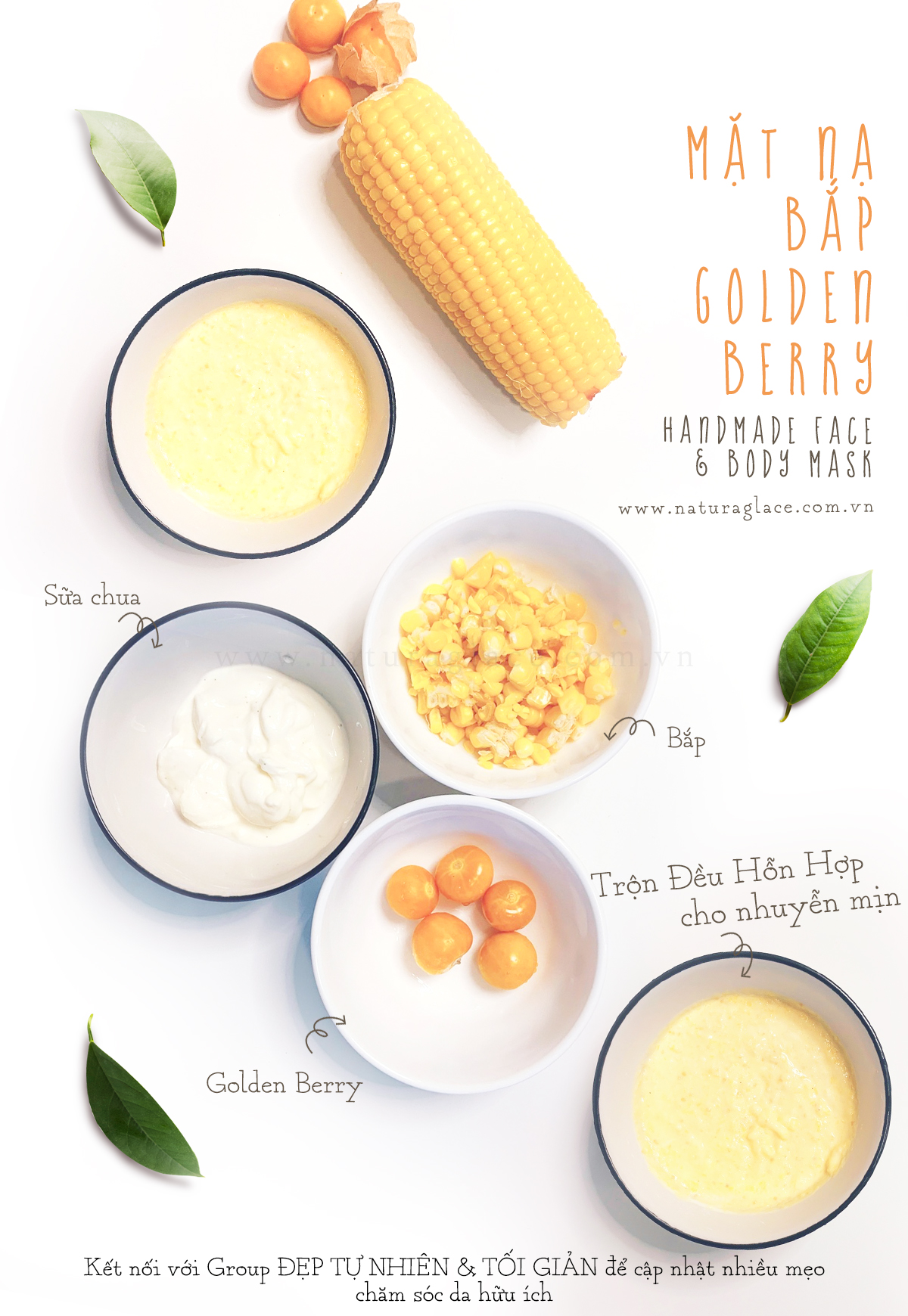 • Bước 1: hạt bắp luộc chín, 1 muỗng sữa chua, quả thù lù thái nhỏ.