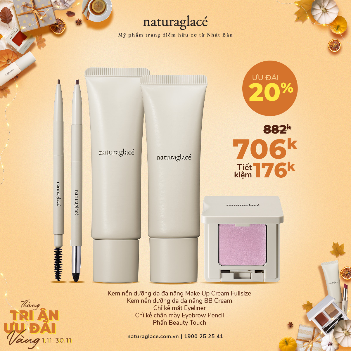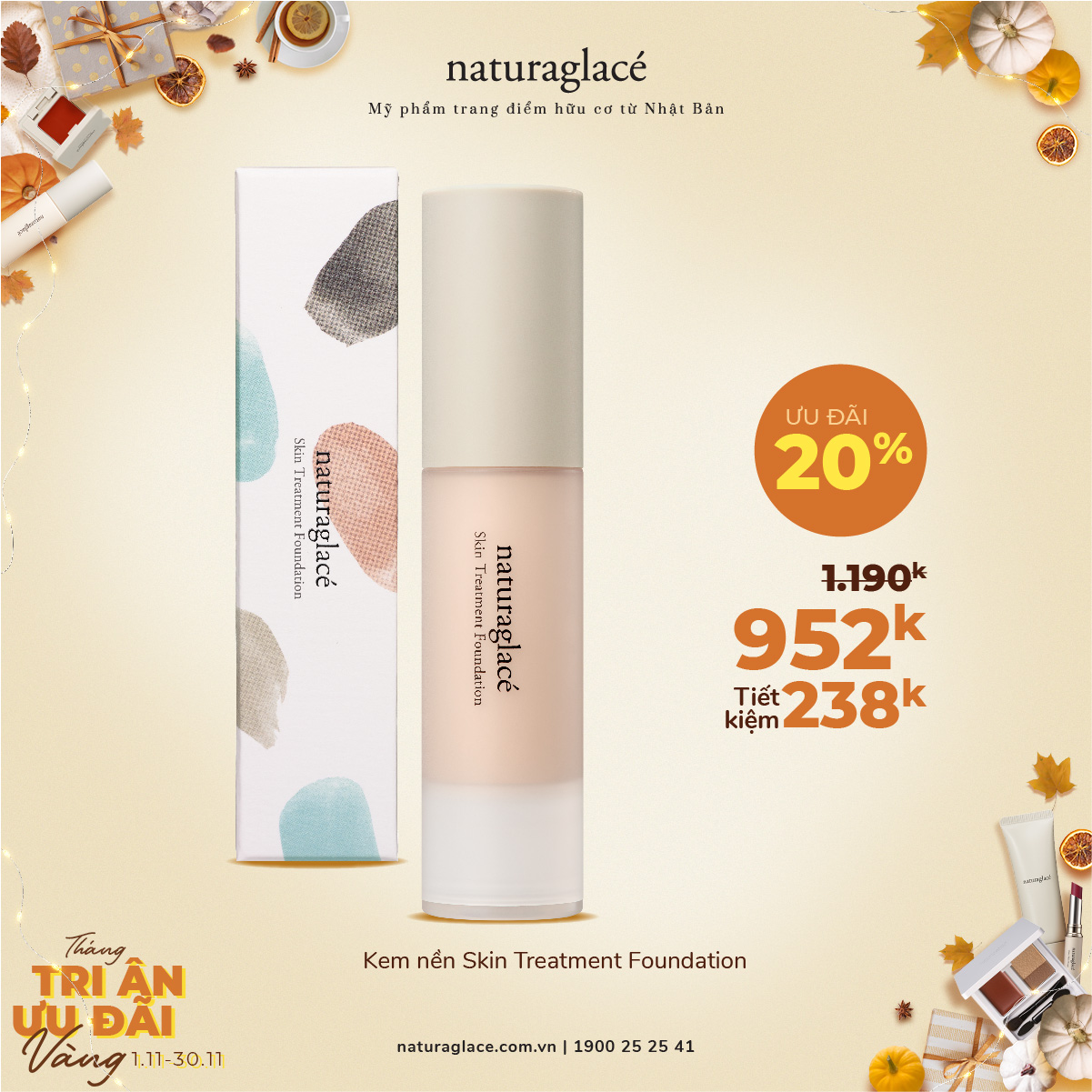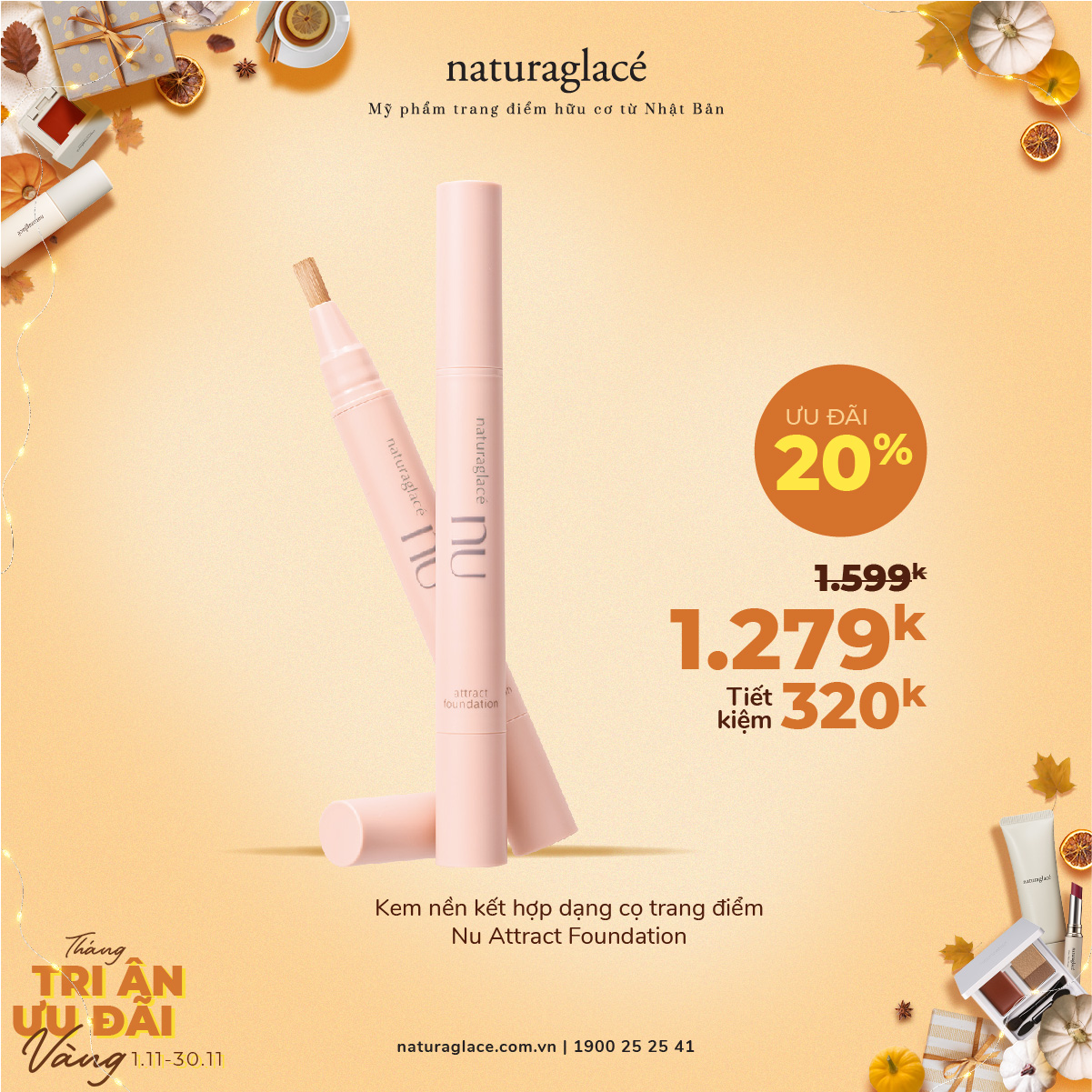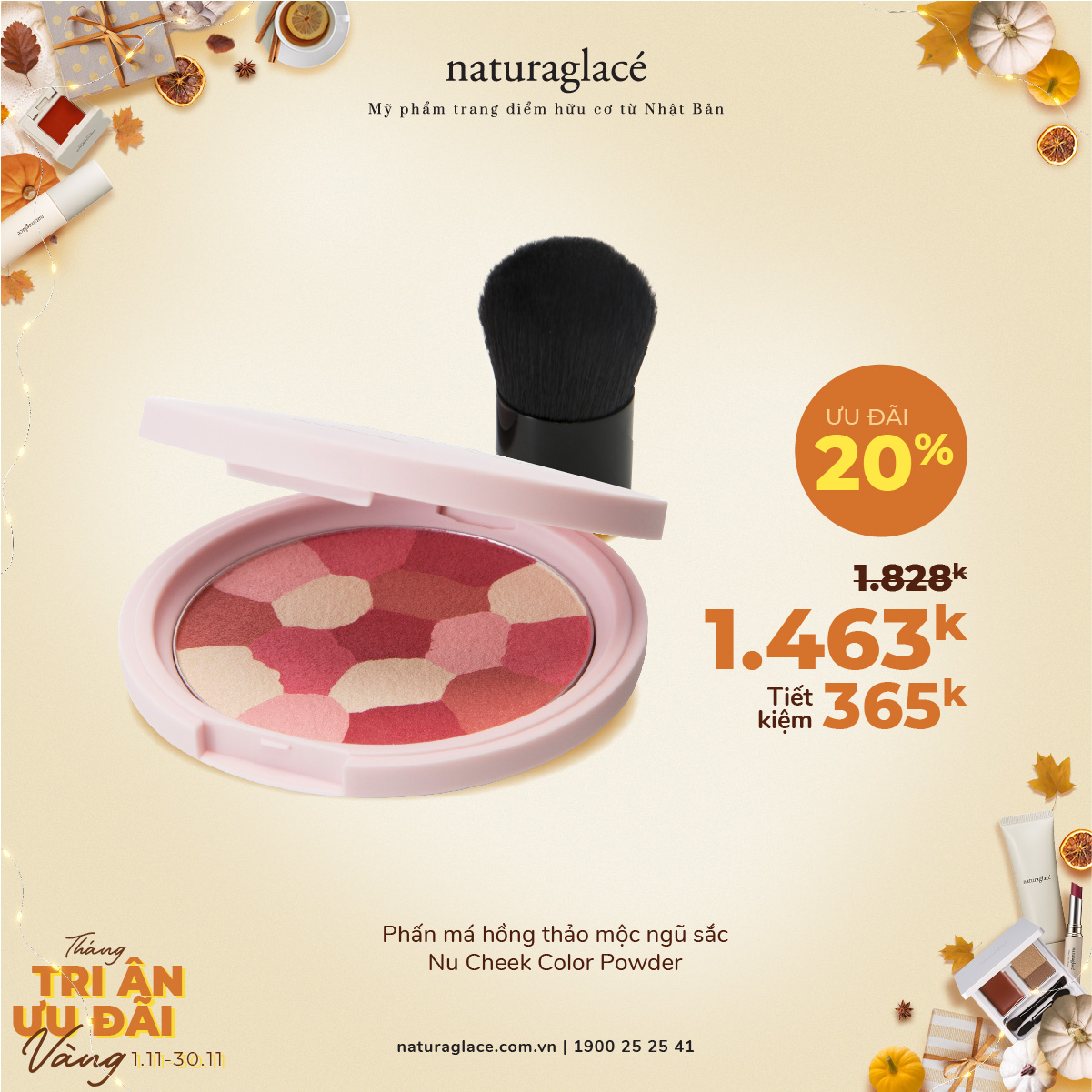 Từ 1/11 -30/11, ưu đãi 20 tất cả mỹ phẩm và tặng quà giá trị kèm theo mỗi hóa đơn mua hàng.